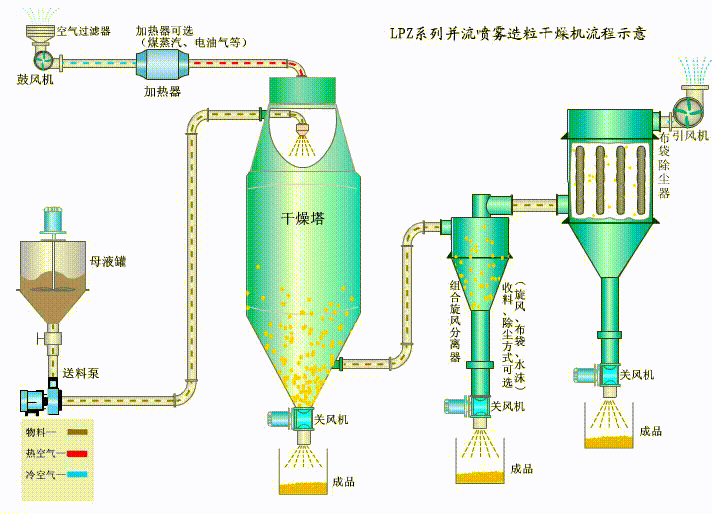 3、使用范圍廣,可進行熱風(fēng)干燥、造粒、也可以進行冷卻造粒、噴霧結(jié)晶、噴霧反應(yīng)等;